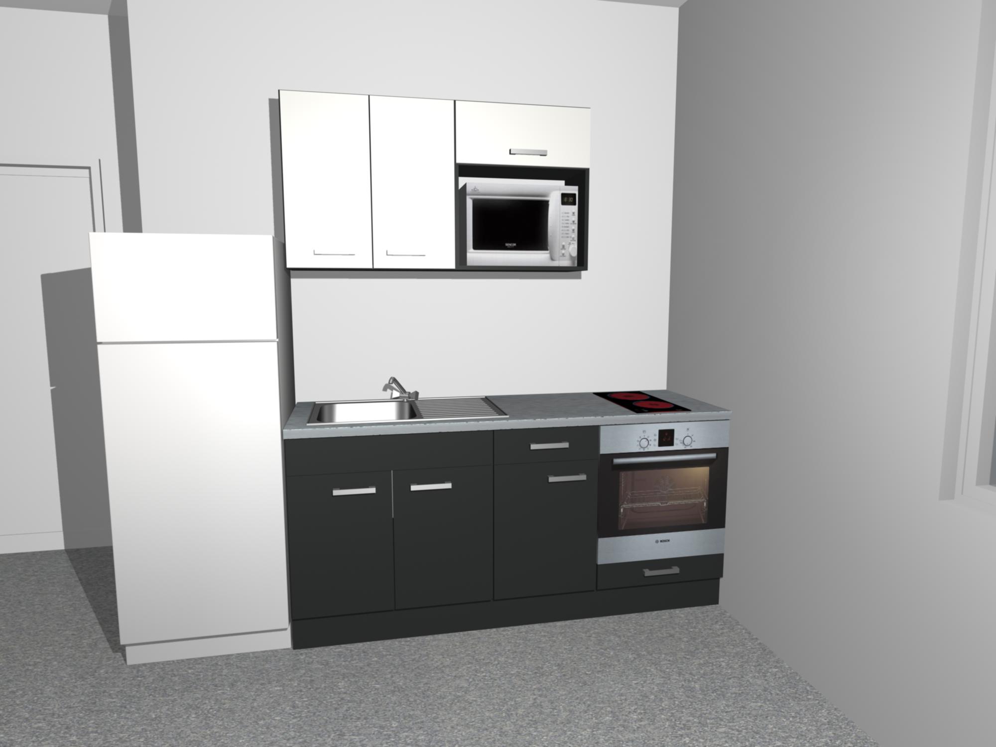 kuchyňská linka vybavená spotřebiči (lednice, mikrovlnná trouba, vestavný, indukční dvouvařič, pečící trouba, dřez)
