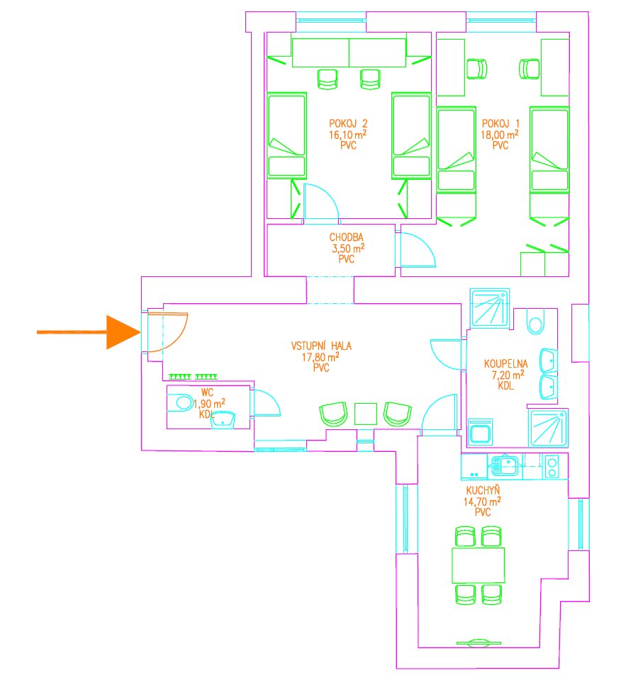 dva pokoje, vstupní hala, velká kuchyň